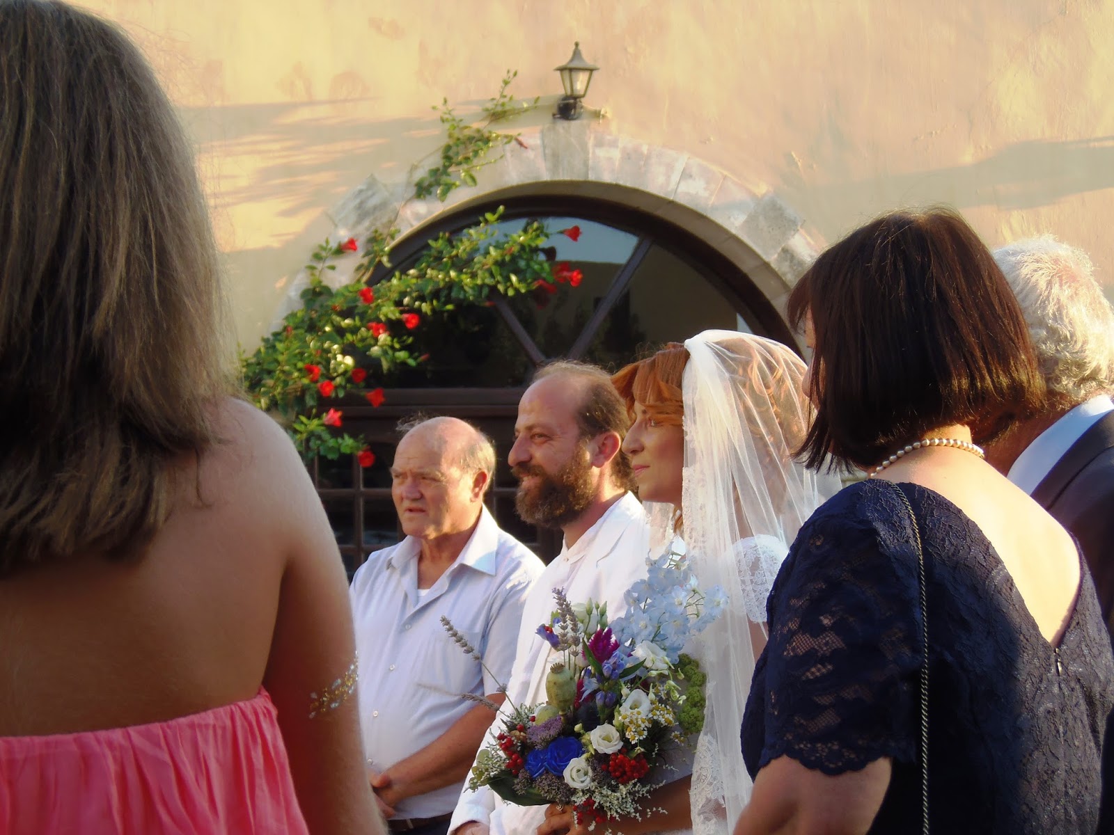Antonia og Lefteris hadde valgt et lite kloster rett utenfor byen med en vakker bystantinsk kirke, som heter Agios Georgios Harodias og det var gjester fra fastlandet og fra utlandet.Antonia er fra Aten og har studert i England. To av hennes medstudenter og romkamerater hadde kommet.