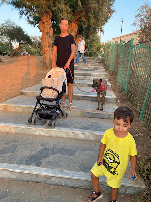 Vi gikk en runde rundt ved Koum Kapi og traff Katerina med Mihalis og Moka. Stor glede for hundene som ikke hadde sett hverandre på et halvt år!! De løp rundt å lekte litt i parken, så ruslet vi alle sammen tilbake langs stranda mens sola gikk ned. Mange badet på stranda og i trappa og kafeene var helt fulle av folk. Det var en fin stemning og månen kom opp over byen.